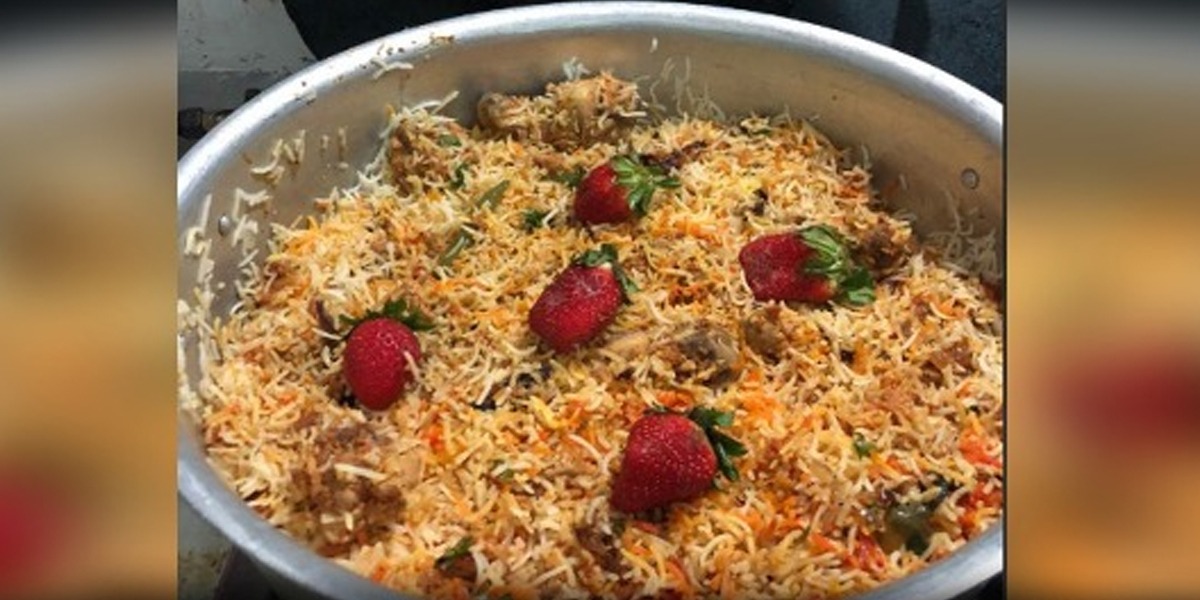 تصویر کو دیکھ کر باخوبی یہ اندازہ لگایا جا سکتا ہے کہ اسٹرابیریز کو بریانی پکتے ہوئے شامل نہیں کیا گیا بلکہ بعد میں اوپر سے رکھا گیا ہے۔