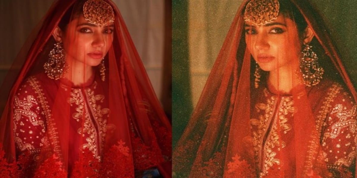 ماہرہ خان کی جانب سے پوسٹ کی گئیں تصاویر میں دیکھا جا سکتا ہے کہ وہ سرخ رنگ کا لباس زیب تن کی ہوئیں ہیں اور لال گھونگھٹ بھی لی ہوئی ہیں جو ان کی خوبصورتی میں مزید اضافہ کررہا ہے۔