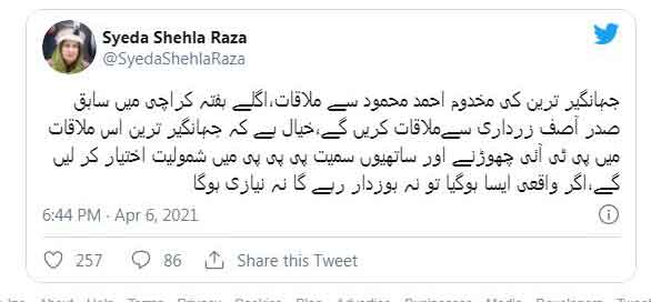 شہلا رضا نے سماجی رابطے کی ویب سائٹ ٹویٹر پر ٹویٹ کرتے ہوئے کہا کہ جہانگیر ترین نے مخدوم احمد محمود سے ملاقات کی ہے اور اگلے ہفتے کراچی میں سابق صدر آصف زرداری سے ملاقات کریں گے۔