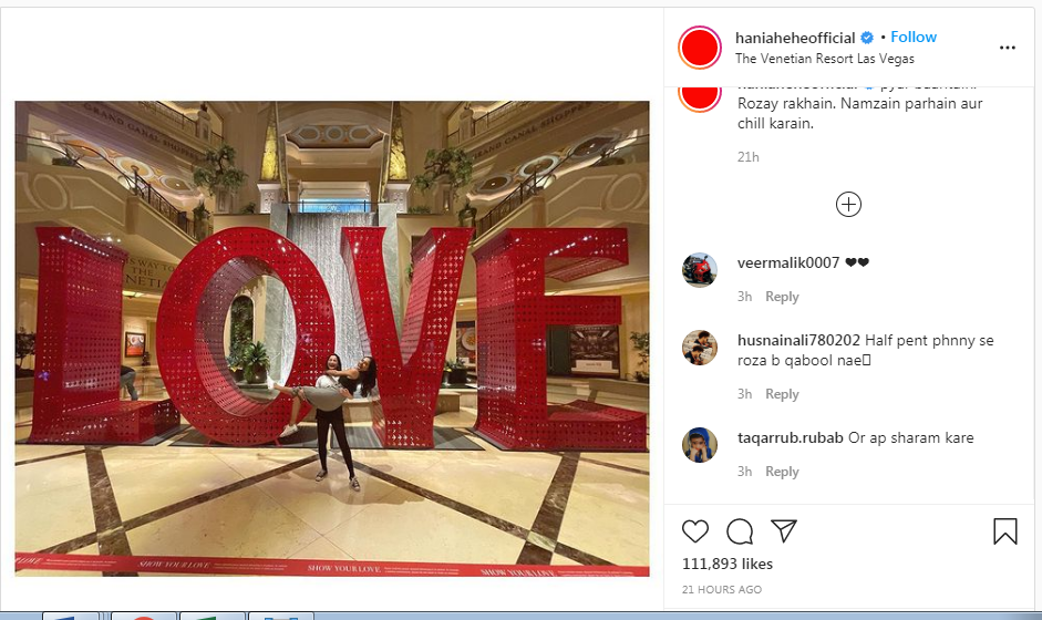 ہانیہ کی اس تصویر پر انسٹاگرام صارفین کی جانب سے کامنٹس کیے جا رہے ہیں جس میں صارفین اداکارہ کے لباس پر تنقید کررہے ہیں۔