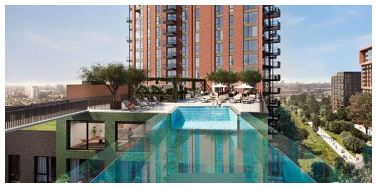 غیر ملکی خبررساں ادارے کے مطابق لندن کے نائن ایلمز بزنس ڈسٹرکٹ میں دو عمارتوں کے درمیان آسمانی سوئمنگ پُول کو تیار کیا گیا ہے۔
