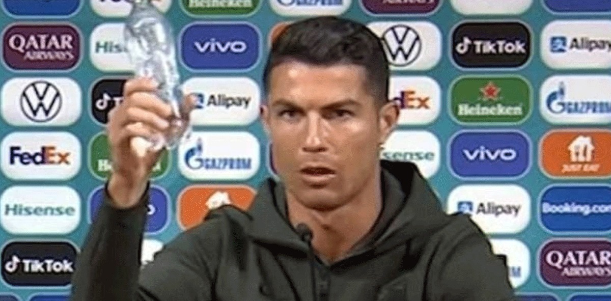 تاہم لیکن کرسٹیانو رونالڈو نے وہ بوتلیں اپنے سامنے سے ہٹاکر دوسری جانب رکھ دیں اور کیمرے کے سامنے اپنی پانی کی بوتل لہرائی اور پرتگالی زبان میں ’ایگوا‘ کہا جس کا مطلب ‘پانی’ ہے یعنی انہوں نے مداحوں کو سوڈا کے بجائے پانی کا انتخاب کرنے پر بھی زور دیا۔