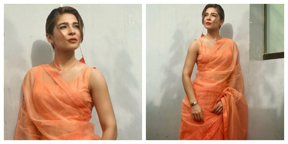 عائشہ عمر کی جانب سے پوسٹ کی جانے والی تصویر میں دیکھا جا سکتا ہے کہ وہ اورنج رنگ کی ساڑھی زیب تن کی ہوئی ہیں جو ان کی خوبصورتی میں مزید اضافہ کر رہی ہے۔