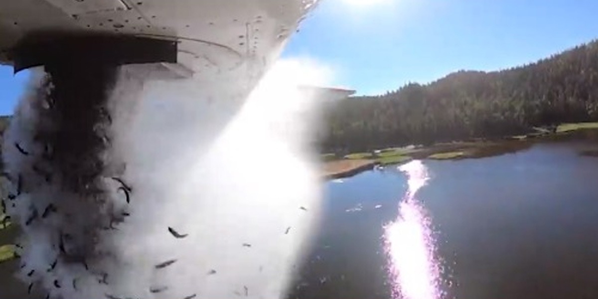 سوشل میڈیا پر ایک ویڈیو وائرل ہو رہی ہے جس میں دکھایا گیا ہے کہ امریکا میں ریاست یوتھا کی ایک جھیل میں مچھلیوں کی کم ہوتی ہوئی تعداد کو بڑھانے کے لیے فضا سے ایک جہاز کے ذریعے جھیل میں ہزاروں مچھلیاں گرائی جارہی ہیں۔