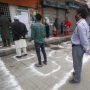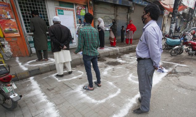 People stand in circles drawn with chalk to maintain safe distance outside a bank, during a lockdown, after Pakistan shut all markets, public places and discouraged large gatherings amid an outbreak of coronavirus disease (COVID-19), in Lahore, Pakistan March 30, 2020. REUTERS/Mohsin Raza