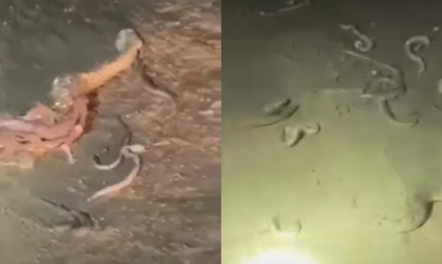 اس سلسلے میں ایک ویڈیو سامنے آئی ہے، جس میں بڑی تعداد میں سانپوں اور ایک اژدہے کو رینگتے ہوئے دیکھا جا سکتا ہے۔