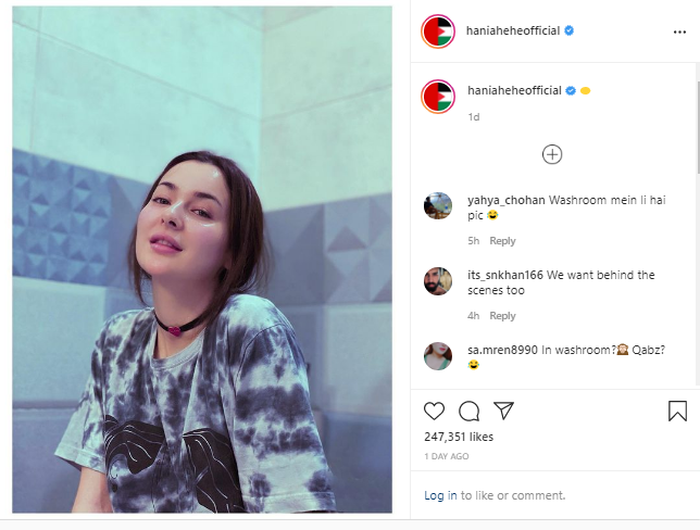انسٹا گرام اکاؤنٹ پر شیئرکی جانی والی تصویر میں ہانیہ عامر کی تصویر سے اندازہ ہو رہا ہے کہ اداکارہ نے یہ تصویر باتھ روم میں لی ہے۔