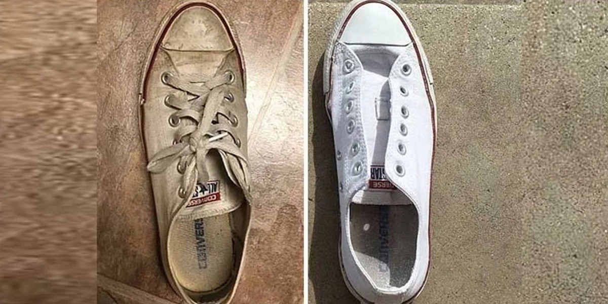 سب سے پہلے اپنے پرانے جوتے کو پہلے پانی سے دھو لیں، پھر ایک چمچ کپڑے دھونے کے سوڈے میں ڈیڑھ چمچ میٹھا سوڈا ملا لیں اور اسے ٹوتھ برش کے ساتھ جوتوں پر رگڑیں۔