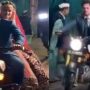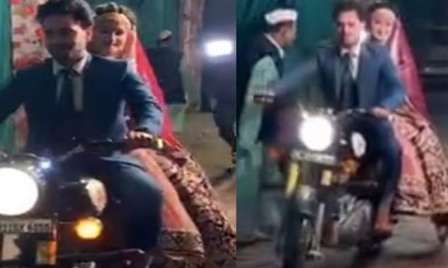 دلہا میاں ایک موٹر سائیکل پر اپنی دلہن کے ہمراہ داخل ہوتے ہیں، دلہن جو کہ شادی کا لہنگا پہنے دلہا کے پیچھے بائیک پر بیٹھی انتہائی خوش نظر آرہی ہیں۔