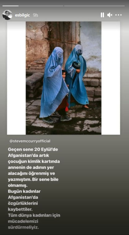 اسرا بلگیچ (حلیمہ سلطان) نےاپنی انسٹا اسٹوری پر افغان خواتین کے بارے میں ایک پوسٹ شیئر کی، جس کے کیپشن میں انہوں نے ترک زبان میں لکھا کہ پچھلے سال ، 20 ستمبر کو ، افغانستان میں اس بات کا اعلان کیا گیا تھا کہ اب بچے کے شناختی کارڈ پر ماں کا نام بھی درج کیاجائے گا۔