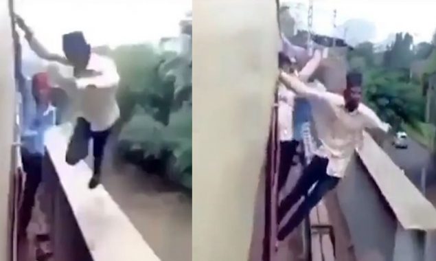 ویڈیو میں دیکھا جاسکتا ہے کہ پہلے تو دو نوجوان لڑکے چلتی ہوئی ٹرین پر لٹکتے ہیں اور پھر ایسے کرتب دکھاتے ہیں کہ جیسے وہ جھولا جھول رہے ہوں۔