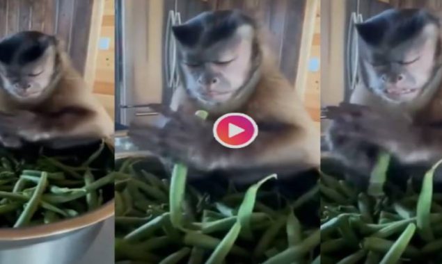 ویڈیو میں دیکھا جاسکتا ہے کہ یہ پالتو بندر گھر میں سبزی بنانے میں مصروف ہے جو ایک بڑے برتن میں موجود پھلیوں کو پکانے کےلئے توڑ توڑ کردوبارہ اسی برتن میں رکھ رہا ہے۔