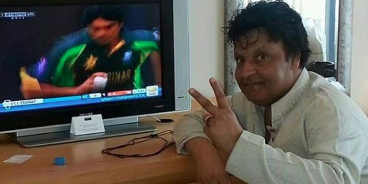 شیئر کی گئی تصویر میں عُمر شریف کو ٹی وی اسکرین کے پاس دیکھا جاسکتا ہے جس پر پاکستان کا میچ نشر ہو رہا ہے۔