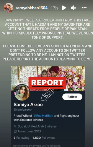 سامعہ آرزو نے اپنے انسٹاگرام اکاؤنٹ پر اسٹوری پوسٹ کی اور لکھا کہ اس اکاؤنٹ سے منسوب بہت سے ٹوئٹس زیر گردش ہیں کہ مجھے، حسن اور ہماری بیٹی کو پاکستانی لوگوں سے دھمکیاں مل رہی ہیں جو کہ بالکل غلط ہے بلکہ لوگوں کی جانب سے ہماری حمایت کی جارہی ہے۔