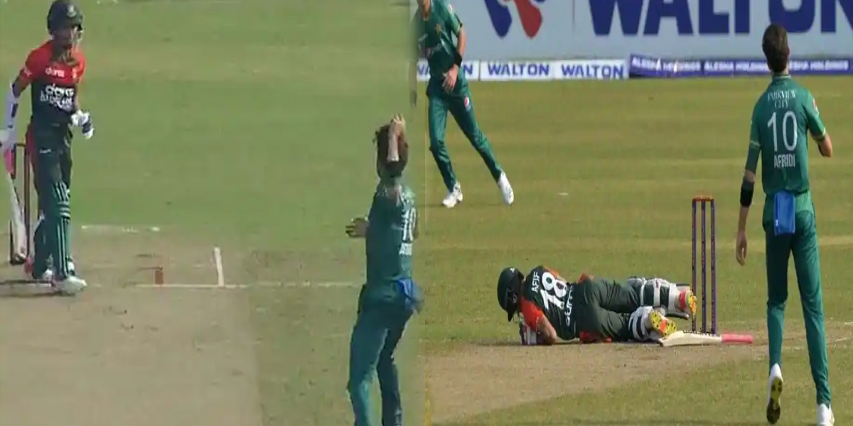 پاکستانی بولر شاہین آفریدی نے میچ کے دوران گیند فیلڈ کرتے ہی اسے بنگلادیشی بیٹسمین عفیف حسین کی جانب پھینکی تھی۔