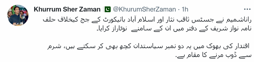 پاکستان تحریک انصاف کراچی کے صدر اور رکن صوبائی اسمبلی خرم شیر زمان کا کہنا ہے کہ گلگت بلتستان کے سابق چیف جج رانا شمیم نے جسٹس ثاقب نثار اور اسلام آباد ہائیکورٹ کے جج کے خلاف حلف نامہ نواز شریف کے دفتر میں ان کے سامنے نوٹرائز کرایا۔