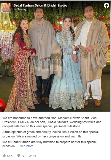 گذشتہ روز صدف نے فیس بک پر پوسٹ کرکے شکریہ لکھا اور کہا کہ یہ ہمارے لئے فخر کی بات ہے کہ ہم نے مریم نواز کو ان کی مرضی کے لک جیسا حسین تیار کیا۔