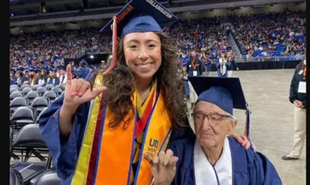 امریکن کالج نے اپنے سوشل میڈیا اکاؤنٹ پر ایک تصویر شیئر کی جس میں دیکھا جا سکتا ہے کہ کالج کے ایک 87 سالہ شخص نے اپنی پوتی کے ساتھ گریجویشن مکمل کیا ہے۔