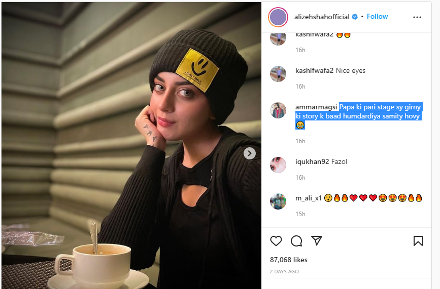 انسٹاگرام پر اداکارہ علیزے کی اس تصویر پر سوشل میڈیا صارفین کمنٹ باکس میں اداکارہ کا مذاق بنا رہے ہیں۔