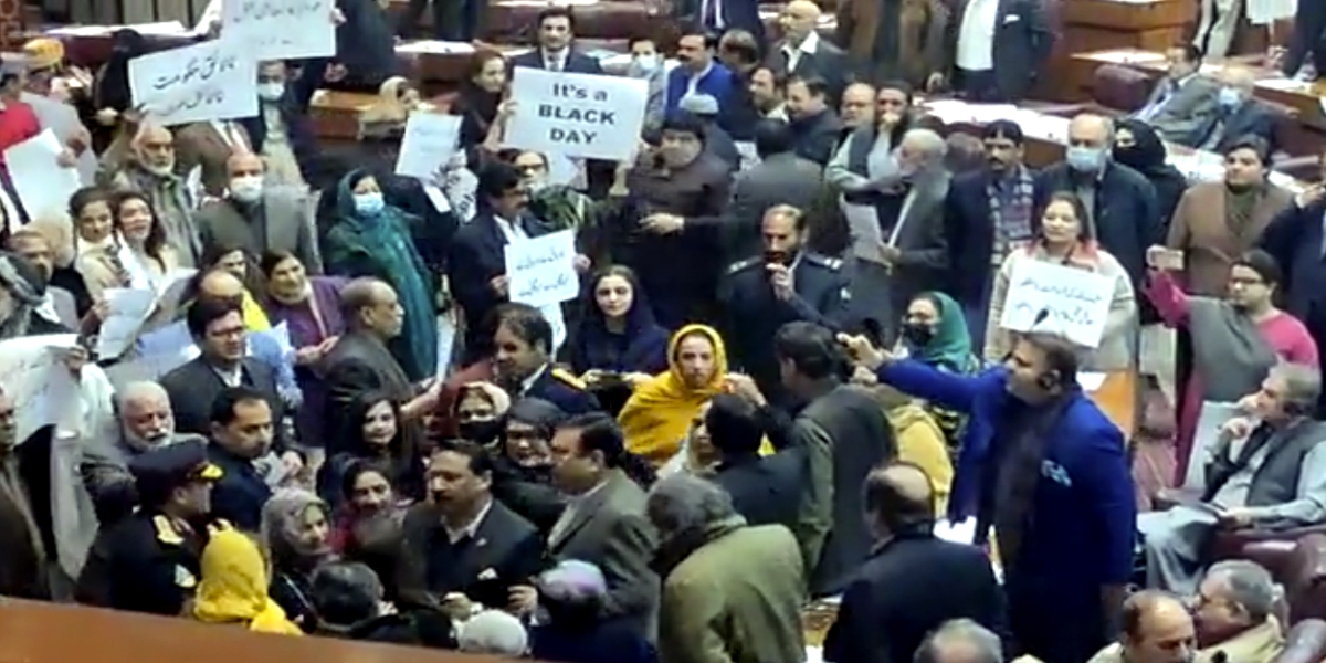 اجلاس کے آغاز سے ہی اپوزیشن جماعتوں نے قومی اسمبلی میں احتجاج شروع کردیا تھا اور اپنی نشستوں سے اٹھ کر اسپیکر قومی اسمبلی کے ڈائس کے قریب جمع ہوگئے اور نعرے بازی شروع کردی۔