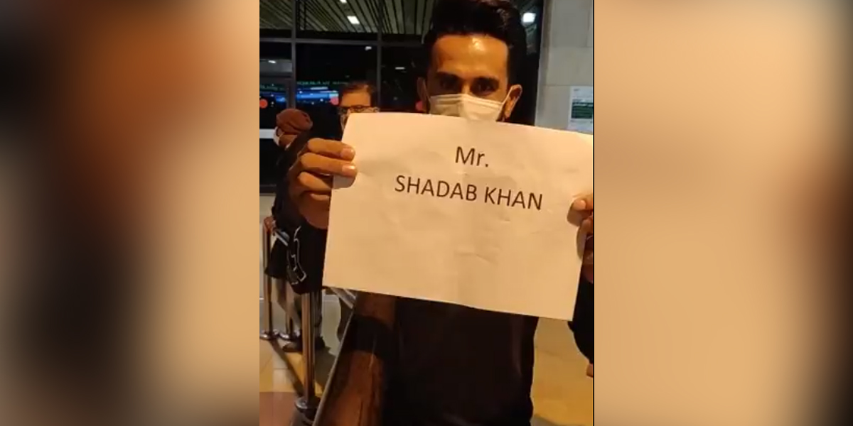 حسن علی نے شاداب خان کو ریسیو کرنے لیے ہاتھ میں ایک پیپر بھی اٹھا رکھا تھا جس پر انگریزی میں Mr Shadab Khan تحریر تھا۔