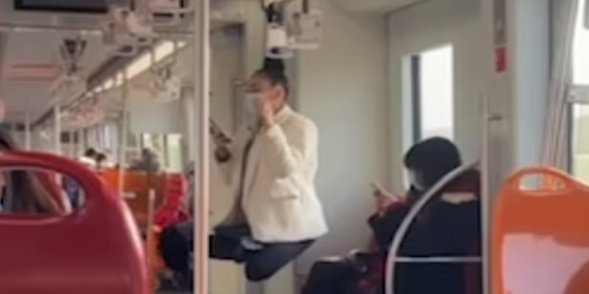 ٹرین میں سوار ہونے والے مسافر ایک خاتون کو بالوں کے سہارے ہینڈریل پر جھولتے دیکھ کر حیران رہ گئے۔