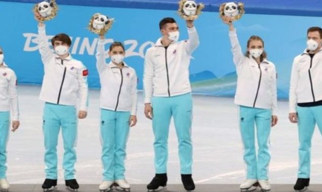 روس کی فگر اسکیٹنگ ٹیم نے اپنے طور پر گراؤنڈ میں ہی جیت کا جشن بھی منا لیا ہے، روسی فگر اسکیٹنگ ٹیم نے اپنے ہاتھوں میں بیجنگ ونٹر اولمپک گیمز کے میسکوٹ ٹیڈی بئیر کو اپنے ہاتھوں میں اٹھا رکھا تھا۔