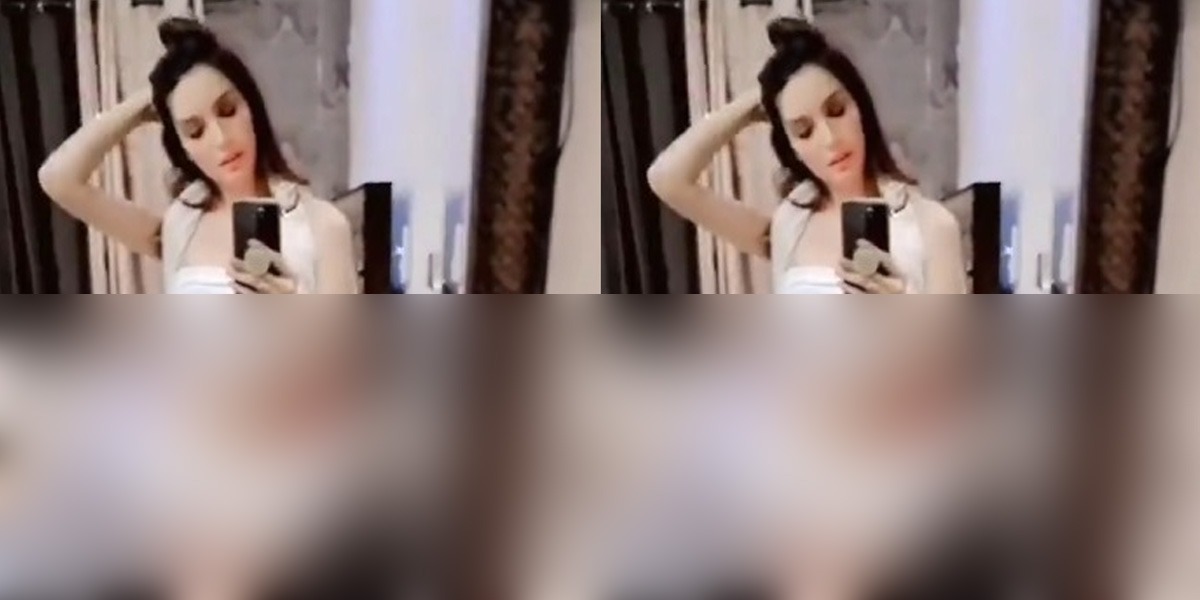 انہوں نے اپنے پوشیدہ اعضاء کو صرف سفید رنگ کے کپڑوں کے دو ٹکڑوں سے ڈھانپا ہوا ہے، ساتھ ہی اپنے ہاتھ میں کیمرہ لیے خود کو آئینے میں دیکھ کر فلما بھی رہی ہیں۔