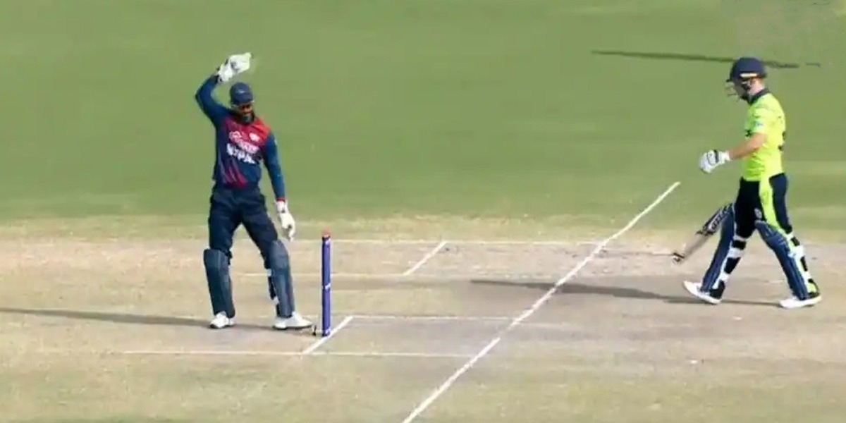 میچ کے دوران ایک لمحے پر آئر لینڈ کے بیٹر رن لینے کے دوران بالرسے ٹکرا کر سلپ ہو کر کریز پر گر پڑے، نیپالی بالر کمال سنگھ نے موقع سے فائدہ اٹھاتے ہوئے گیند وکٹ کیپر آصف شیخ کی طرف تھرو کی۔