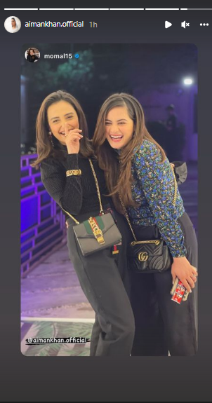 ادکارہ ایمن خان نے فوٹو اینڈ ویڈیو شیئرنگ ایپ انسٹاگرام پر اپنی تصاویر پوسٹ کی ہیں جس میں دیکھا جا سکتا ہے کہ اداکارہ مغربی لباس زیب تن کی ہوئی ہیں ساتھ میں اداکارہ مومل کو بھی دیکھا جا سکتا ہے۔