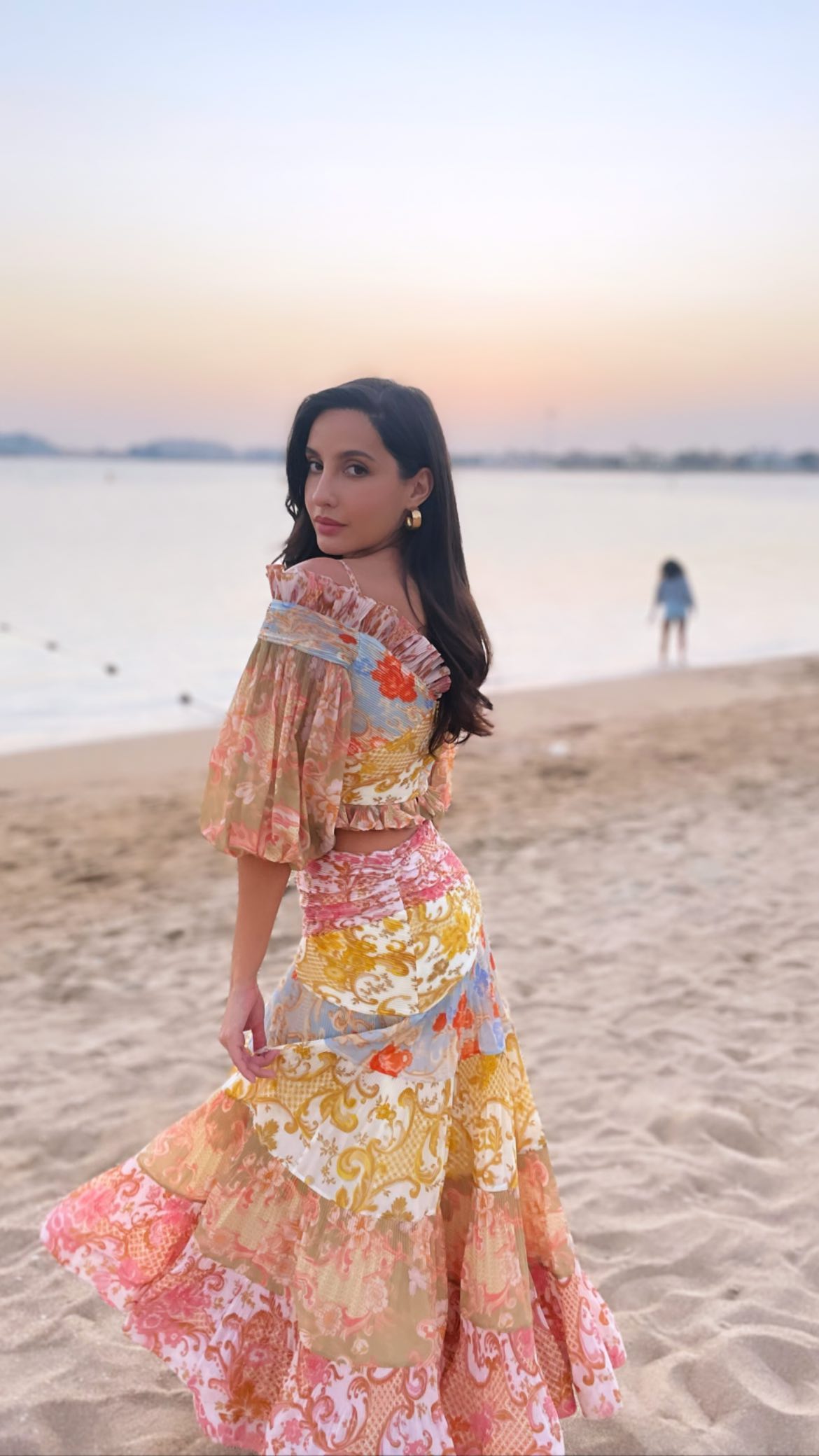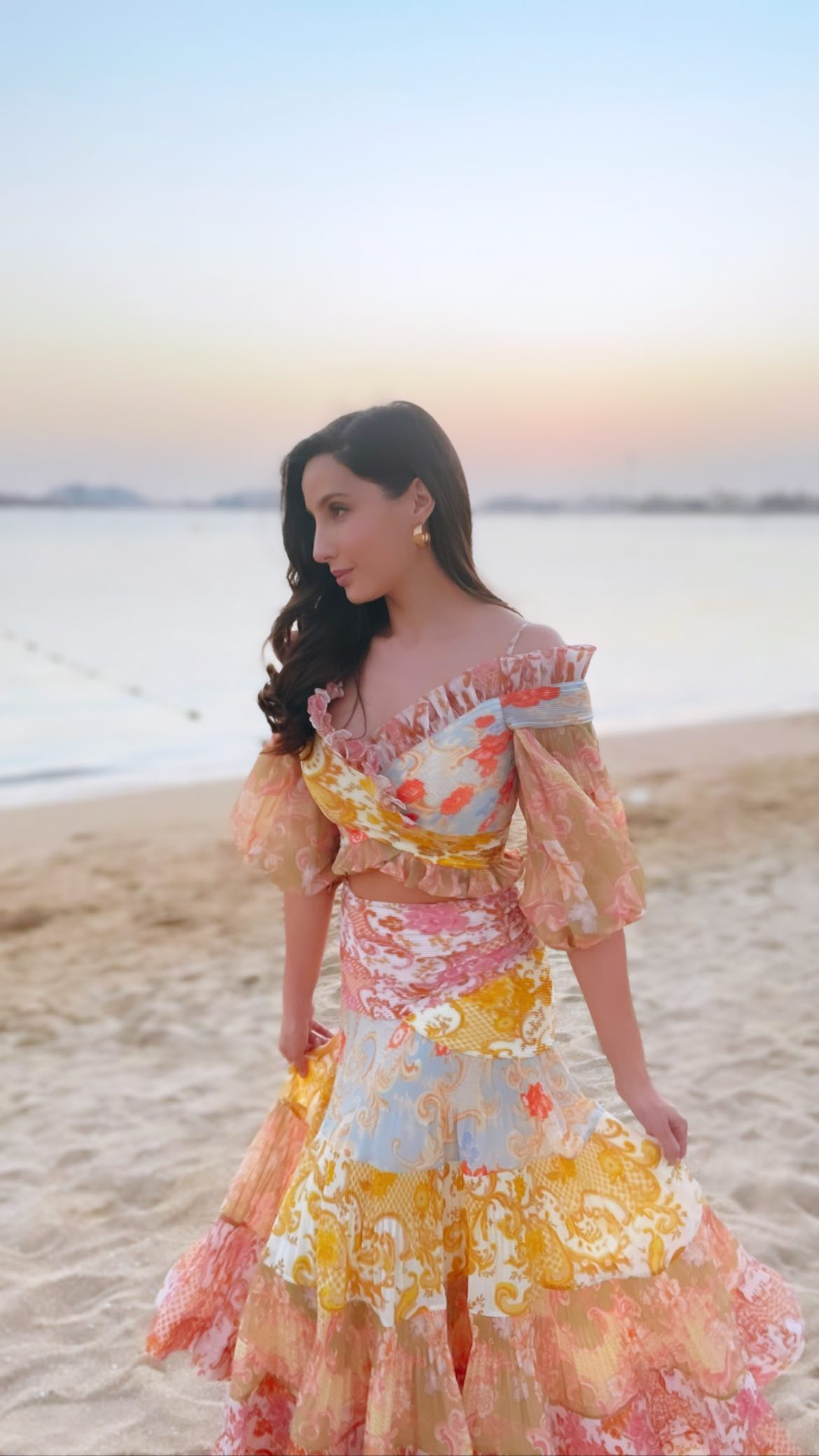اس تصویر میں دیکھا جا سکتا ہے کہ نورا فتیحی نے بھارتی ڈیزائنر کی جانب سے تیار کردہ یہ دلکش لباس نہایت سادہ میک اپ اور ہلکے زیورات کے ہمراہ پہنا ہوا ہے جس کی قیمت تقریباً 2 لاکھ 50 ہزار سے زائد پاکستانی روپے ہے۔