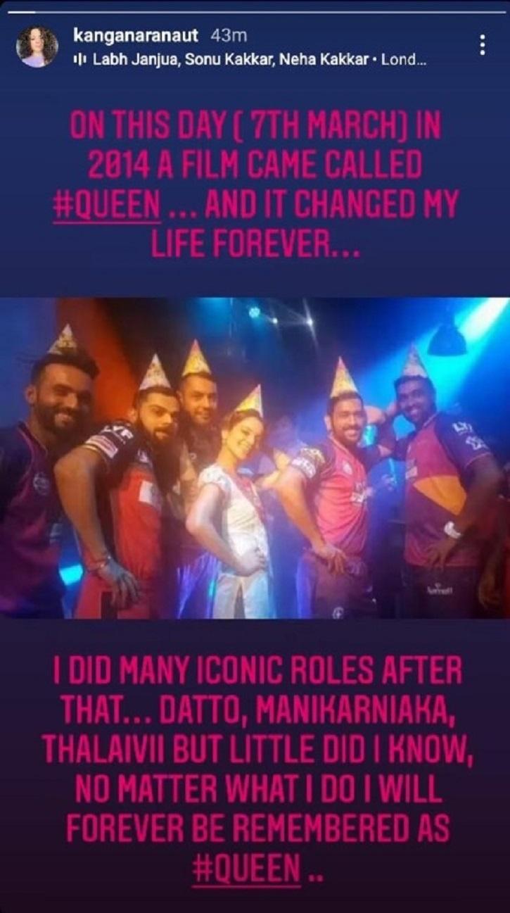 بھارتی میڈیا رپورٹس کے مطابق کنگنا رناوٹ نے اپنی انسٹا اسٹوری پر لکھا کہ فلم ’کوئین‘ نے ہمیشہ کے لیے میری زندگی تبدیل کردی۔