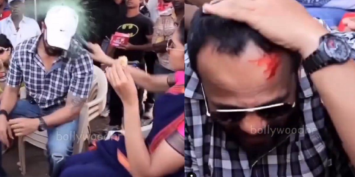 ایک ویڈیو میں ہم دیکھتے ہیں کہ اداکارہ نے ہدایت کار روہت شیٹی کے سر پر شیشے کی بوتل سے حملہ کیا اور ان کے سر سے خون بہنے لگا۔