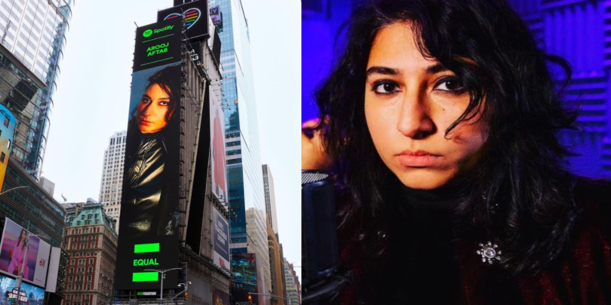 گلوکارہ عروج آفتاب کی تصویر کو ٹائمز اسکوائر بل بورڈ پر آڈیو اسٹریمنگ سروس اسپاٹی فائی کی’ایکوئل پاکستان‘ کے لیے ایمبیسیڈر کے طور پرآویزاں کیا گیا ہے۔