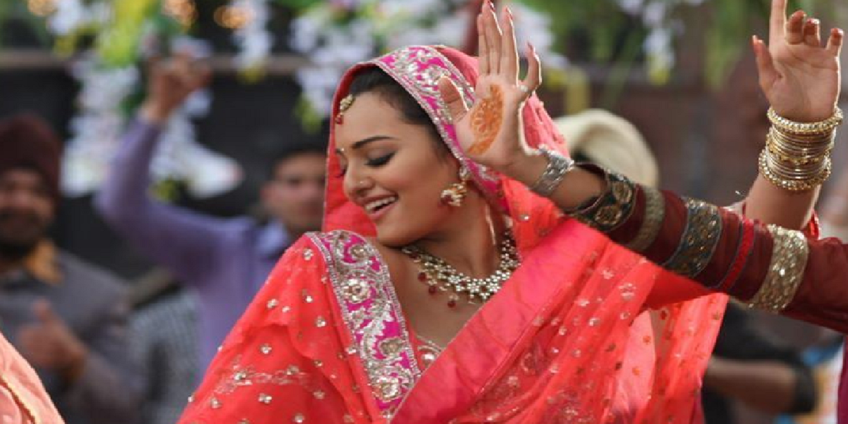 تصویر میں سوناکشی کو سرخ رنگ کی ساڑھی میں ملبوس دکھایا گیا، جبکہ سلمان خان ایک آف وائٹ شیروانی میں نظر آرہے ہیں۔