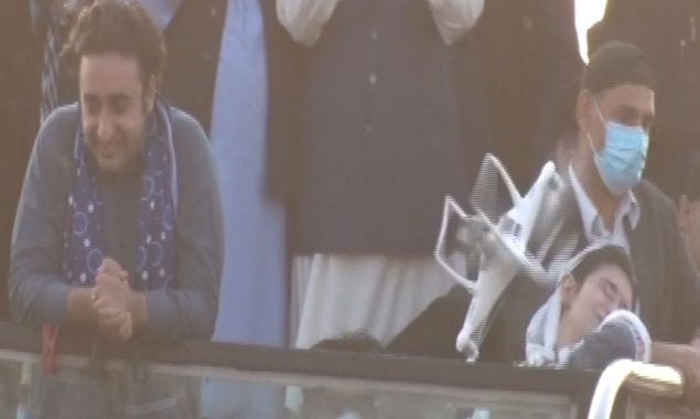 تفصیلات کے مطابق ڈرون کیمرہ کنٹینر پر کھڑی آصفہ بھٹو زرداری کے چہرے سے ٹکرایا، ڈرون ٹکرانے کے بعد آصفہ اور بلاول کنٹینر کے اندر چلے گئے۔