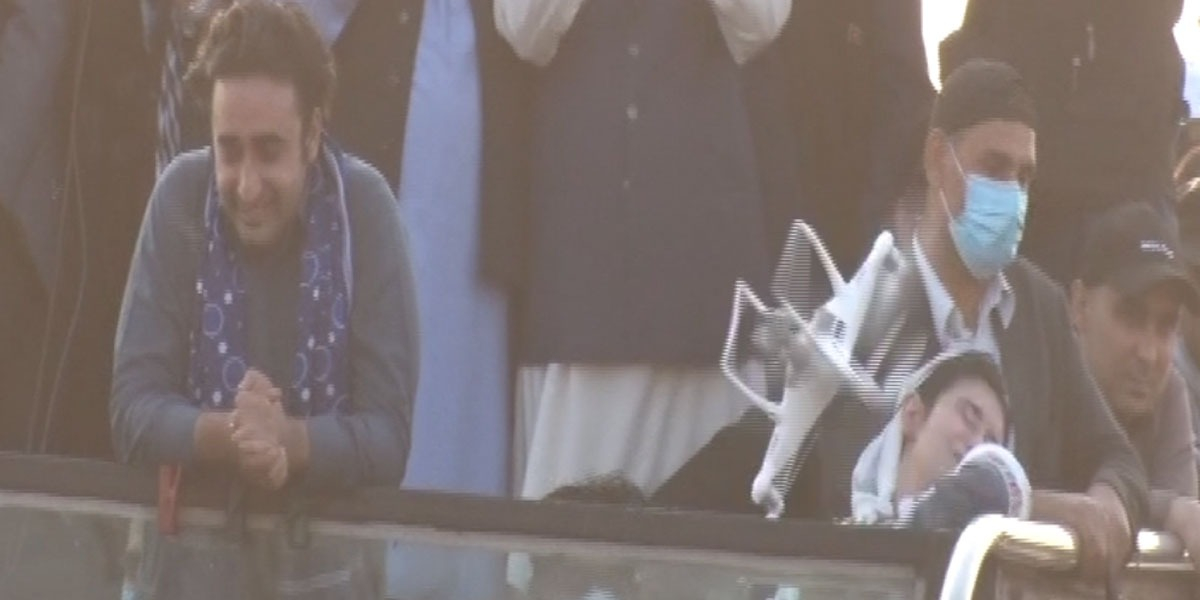 تفصیلات کے مطابق ڈرون کیمرہ کنٹینر پر کھڑی آصفہ بھٹو زرداری کے چہرے سے ٹکرایا، ڈرون ٹکرانے کے بعد آصفہ اور بلاول کنٹینر کے اندر چلے گئے۔