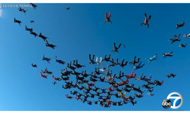 کیلیفورنیا میں لگ بھگ 107 پروفیشنل اسکائی ڈائیور نے یہ ریکارڈ قائم کیا ہے ۔ انہیں انگریزی میں اسکائی ڈائیور اوور سکسٹی یا ایس او ایس کا نام دیا گیا ہے۔ تمام افراد اتوار کی ایک خوشگوار دوپہر کو ریور سائڈ کاؤنٹٰی میں جمع ہوئے۔ پیراشوٹ پہنے، طیاروں میں سوار ہوئے اور مخصوص بلندی سے جست لگا کر برف کے ذرے یا سنوفلیک شکل کی فارمیشن بنائی جو تاریخ کا ایک حصہ بن گئی۔