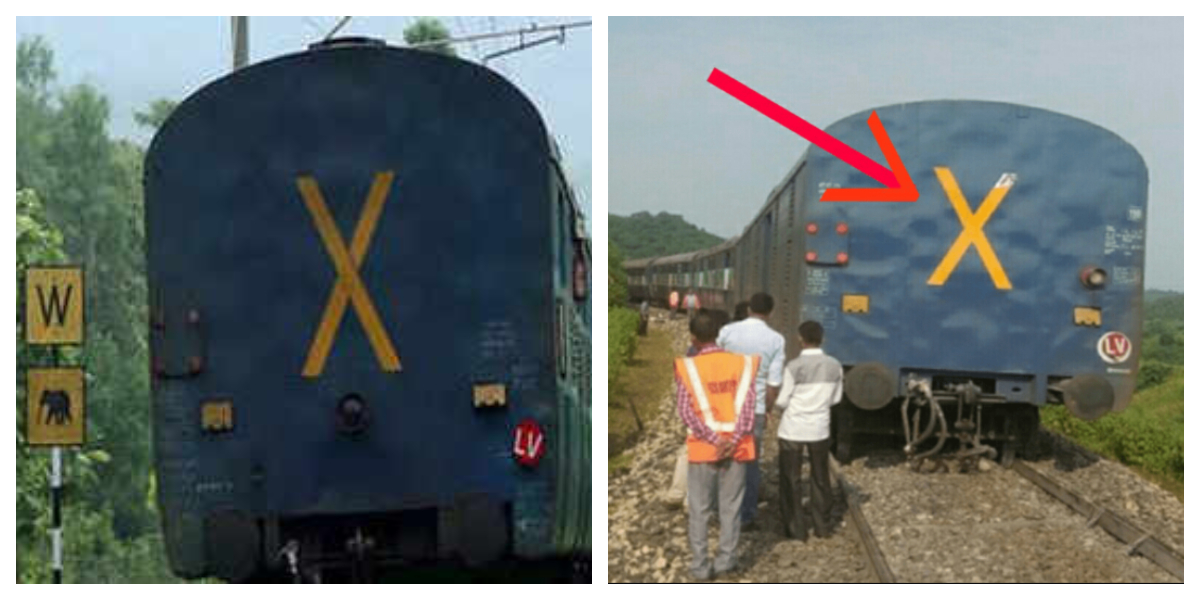 ایکس کا نشان تقریباً ہر طرح کی ٹرین کے پیچھے بنا ہوتا ہے چاہے وہ مسافر ٹرین ہو یا مال گاڑی۔ یہ نشان آگاہ کرتا ہے کہ ٹرین ایک اسٹیشن سے دوسرے اسٹیشن تک پوری آئی ہے کیونکہ اگر یہ نشان نہ ہوتو اسٹیشن پر موجود ریلوے حکام جان لیتے ہیں ہے کہ ضرور ٹرین کے ساتھ کوئی حادثہ پیش آیا ہے جس کی وجہ سے ٹرین پوری اگلے اسٹیشن تک نہیں پہنچ سکی۔ حادثے کی نوعیت کسی بھی قسم کی ہوسکتی ہے۔ یہ نشان عموماً سفید یا پیلے رنگ سے بڑے سائزمیں بنایا جاتا ہے۔