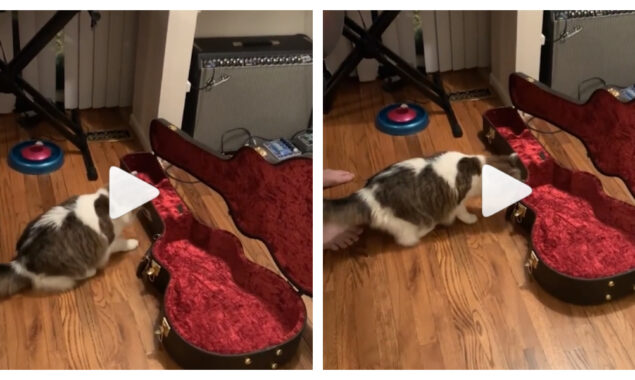 یہاں پر ایک ایسی ہی ویڈیو شیئر کی جارہی ہے جس میں ایک بلی مالک کے گٹار کے ڈبے کو دیکھ کر چھونے کی کوشش کر رہی ہے لیکن ساتھ ہی گٹار کے تاروں کو کی آواز پھر چونک بھی رہی ہے دیکھیں کہ کیسے یہ بلی دونوں کام کررہی ہے۔