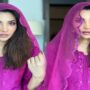 ان تصاویر میں ژالے نے خوبصورت جامنی رنگ کا لباس زیب تن کیا ہوا ہے اور ساتھ ہی انہوں نے سر پر ڈوپٹہ بھی لے رکھا ہے۔