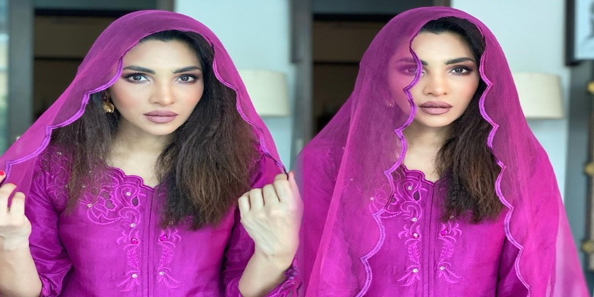 ان تصاویر میں ژالے نے خوبصورت جامنی رنگ کا لباس زیب تن کیا ہوا ہے اور ساتھ ہی انہوں نے سر پر ڈوپٹہ بھی لے رکھا ہے۔