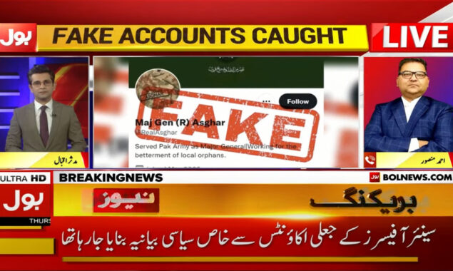 تفصیلات کے مطابق میجر جنرل فیصل مشتاق اور میجر جنرل اصغر کے ہینڈل سے چلائے جانے والے اکاؤنٹس فیک نکلے، جعلی اکاؤنٹس چلانے والوں کا تعلق ایک سیاسی جماعت سے ہے۔