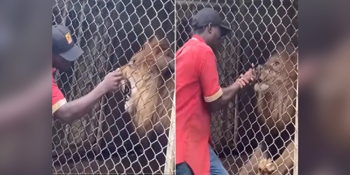 چڑیا گھر کا ملازم شیر کو چھونے کی کوشش کرتا ہے جیسے وہ شیر سے کھیل رہا ہے، لیکن اچانک شیر نے طیش میں آکر اس انگلیاں دبوچ لی، جس کے بعد ملازم نے بہت کوشش کی اپنی انگلیاں شیر کے جبڑے سے چھڑا سکے۔
