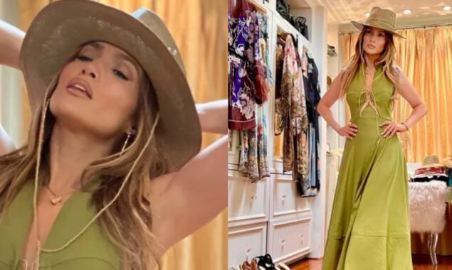 جینیفر لوپیز نے فوٹو شوٹ کی چند تصاویر اپنے ٹوئٹر اور انسٹاگرام اکاؤنٹ پر شیئر کیں، جن میں سے انہیں سبزرنگ کے لباس میں دیکھا جاسکتا ہے۔