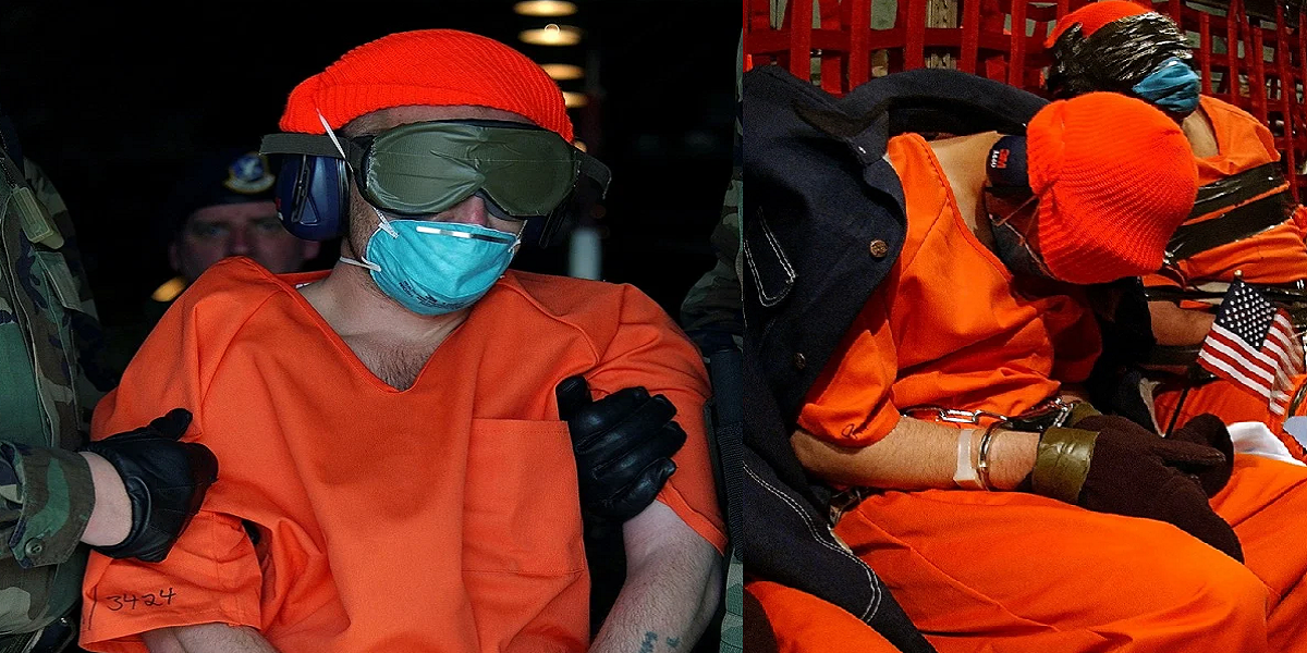 سب سے زیادہ ڈرامائی تصویروں میں سے ایک یہ ظاہر کرتی ہے کہ فوج نے اپنی پہلی قیدیوں کی پرواز کے دوران کس طرح کے نئے اقدامات کیے جو قیدیوں کو گوانتاناموبے لے کر گئی۔