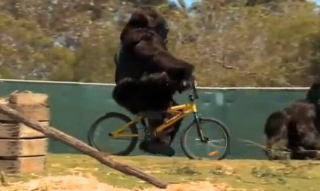 اس ویڈیو میں گوریلا کو سائیکل چلاتے ہوئے دیکھا جا سکتا ہے جو ہنسنے پر مجبور کر دیتا ہے، یہ منظر کچھ لوگوں کے لئے انتہائی دلچسپ بھی ہے جنہوں نے کبھی کسی دیو ہیکل  گوریلا کو مضحکہ خیز انداز میں سائیکل چلاتے نہیں دیکھا۔