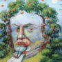 یہ تصویر بہت رنگ برنگی دکھائی دے رہی ہے جس میں کئی چیزیں موجود ہیں، جیسے درخت، سیب، تتلیاں، بیٹھا ہوا شخص اور گھنا جنگل وغیرہ۔