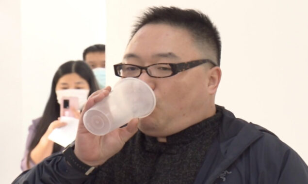 ایک آن لائن چینی سرکاری میڈیا آؤٹ لیٹ کی طرف سے پوسٹ کی گئی ایک ویڈیو میں کمیونٹی ہیلتھ سنٹر میں لوگوں کو اپنے منہ میں ایک سفید کپ کی چھوٹی نوزل ​​چپکتے ہوئے دکھایا گیا ہے۔
