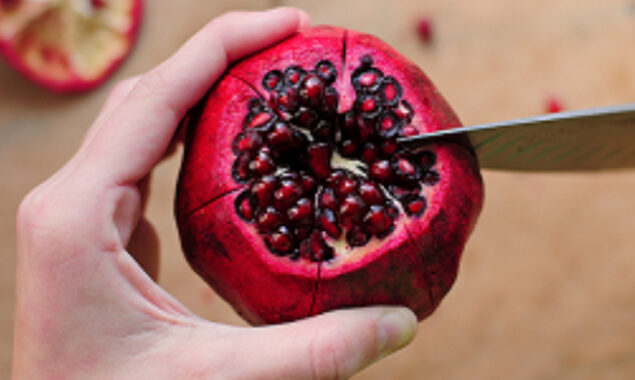 انار پر چھری کی مدد سے 3 سے 4 جگہ نشانات لگالیں اور گہرے نشان لگائیں تاکہ جب آپ اپنی انگلیوں کی مدد سے اس چھلکے کو کھینچنے لگیں تو یہ آسانی سے نکل جائے۔